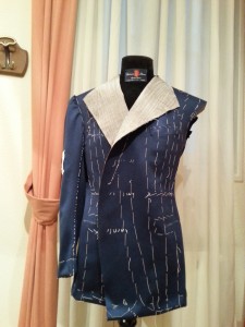 Los pasos que lleva hacer una primera prueba no sirve de mucho para el cliente, ya que en realidad no se llega a ver nada. Sólo se trata de los delanteros hilvanados a una entretela y una manga hilvanada también. Pero en mi opinión, de esta primera prueba, depende más del 50% de la americana, ya que de no estar bien reentrados, hilvanados y aplomados los delanteros, el final del trabajo puede ser catastrófico.