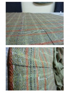 Para el tipo de chaleco que queríamos hacer necesitábamos algo con dibujo, un cuadro ventana como mínimo, para darle ese toque que buscábamos. Finalmente el elegido fue un tejido con un tono verde suave, con unos cuadros formados por dos lineas llamativas en un tono rojizo y dos lineas mas finas de color negro, atravesado por una linea amarilla y cada dos de estas líneas una negra más tenue. Un tejido espectacular, incluso para una chaqueta o un traje de un carácter británico.