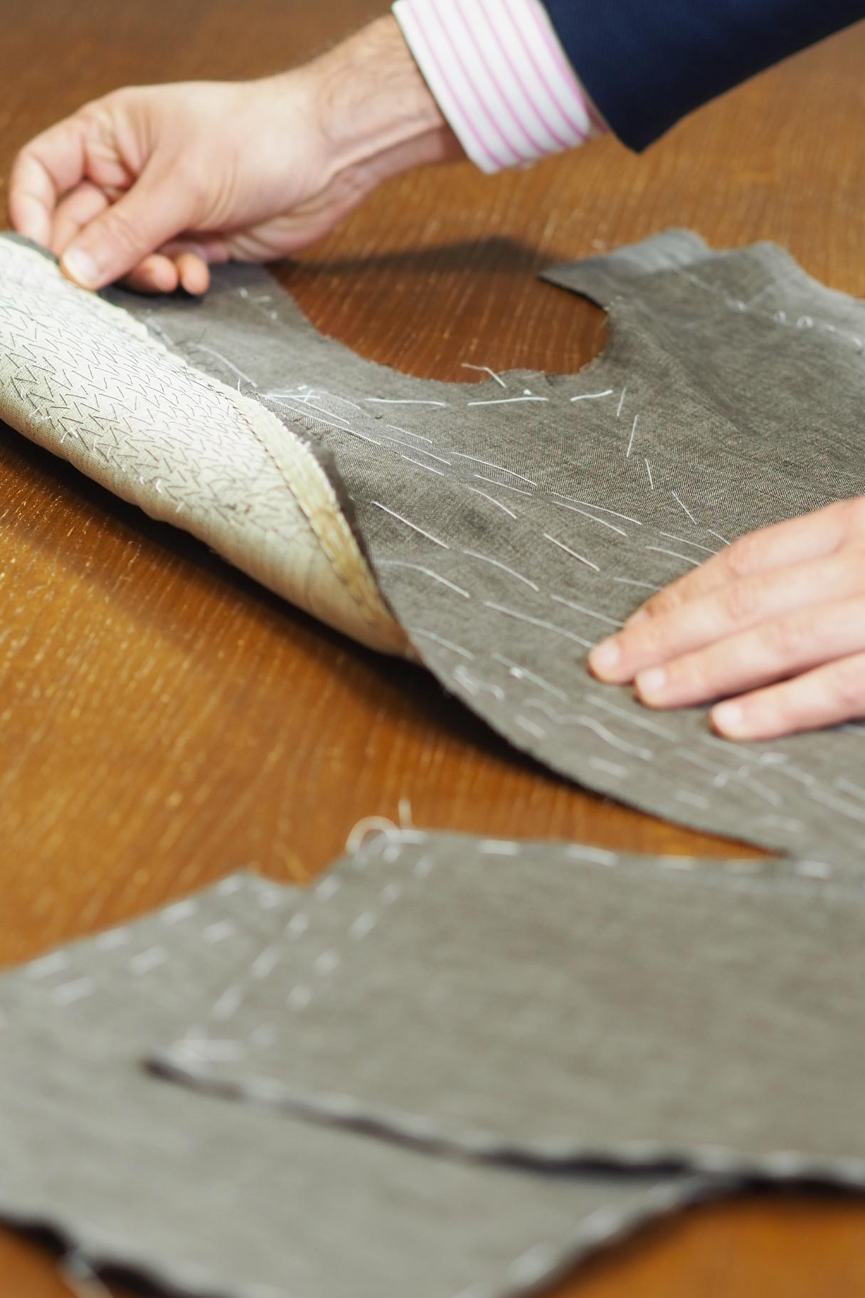 Paso fundamental en sastrería artesanal. Ayudaremos a que nuestra chaqueta mantenga su forma en los bordes de los delanteros por mucho más tiempo, caiga mejor y su vida útil se alargue.